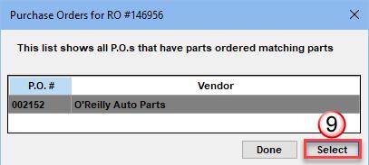 - Then click on Select to open the P.O. Worksheet where you will enter vendor invoice # and receive parts.