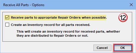 - IMPORTANT: You must check the box for Receive parts to appropriate Repair Orders when possible. (this only needs to be done once) The ‘Create an Inventory record for all parts received’ remains optional.