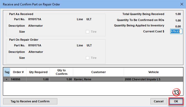 - The ‘Receive and Confirm Part on Repair Order’ screen appears; your part should already be tagged and cost not likely to have changed since you ordered it. That is intended click on OK to continue.