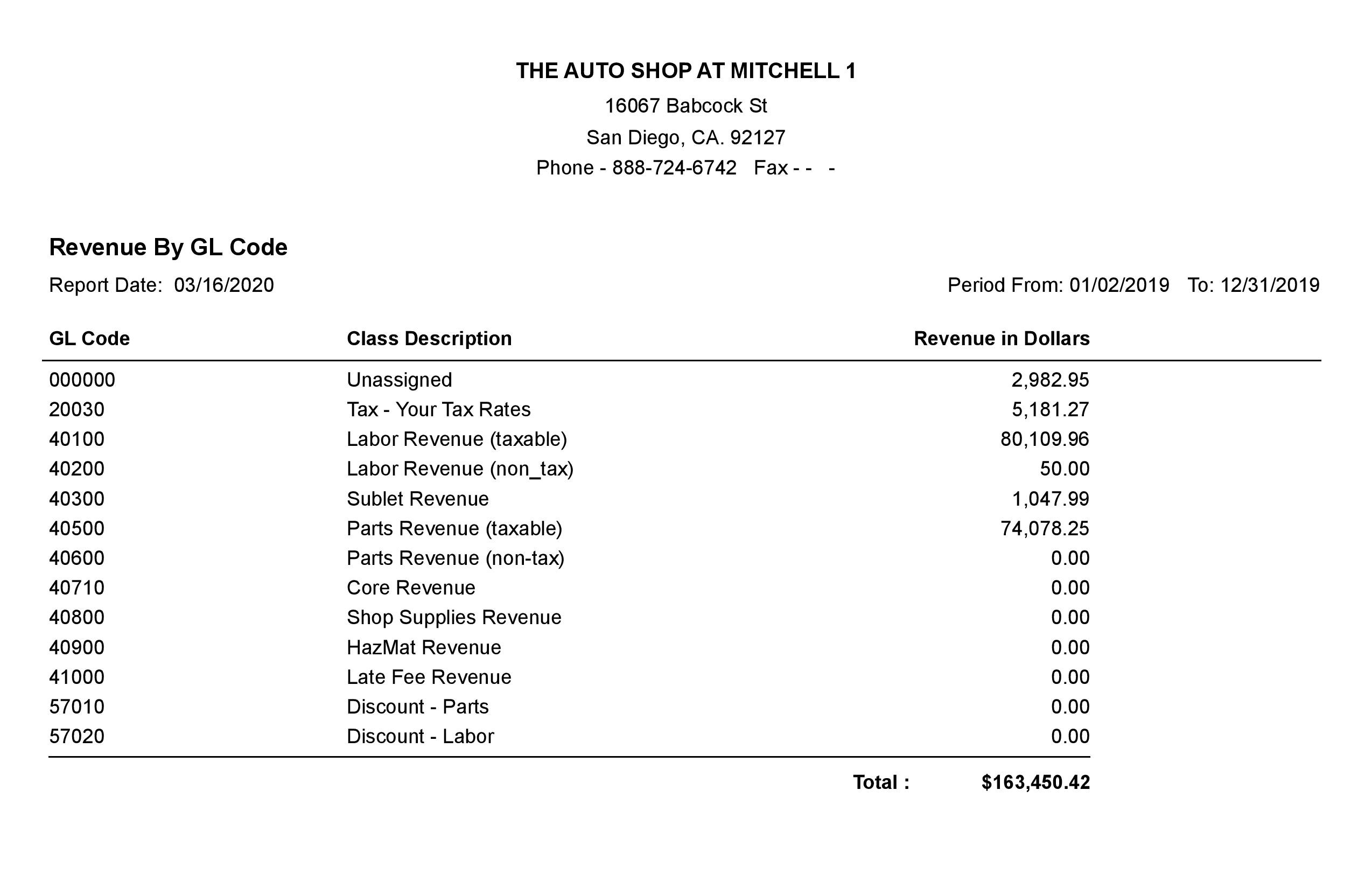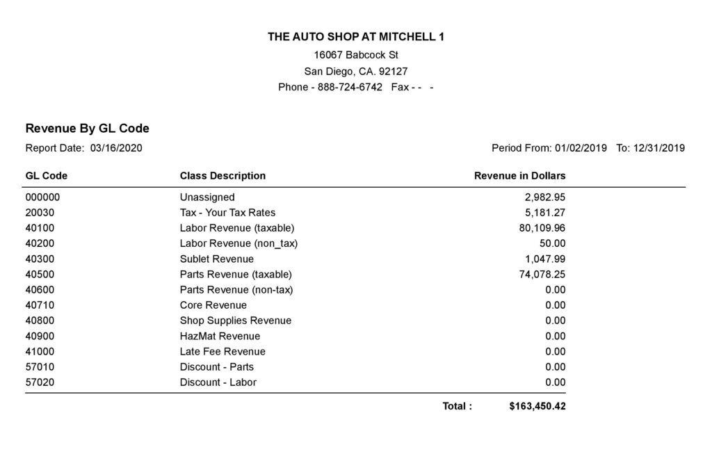 (Figure 3) The Revenue by GL Code Report is also a snapshot of revenue for your shop, but can be inaccurate without proper program setup.