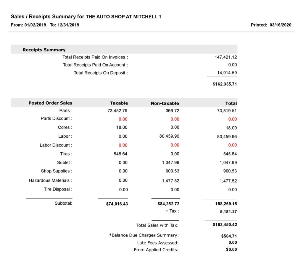 This report will give you a great summary of not only your total revenue taken in and how much tax you owe to your tax bureau, but it also gives you a breakdown of where your revenue is coming from between parts sales, labor sales and those sales that were taxed or not taxed.