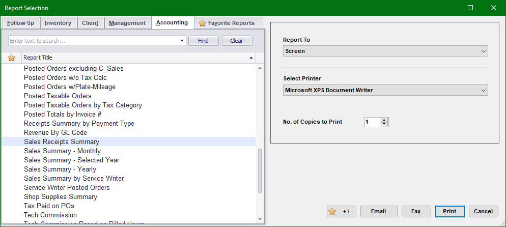 One particular report you will need is called the Sales Receipt Summary report. You can find this report and all other reports by clicking on the reports button at the top of the program. The Sales Receipt Summary report is located under the accounting tab (See Figure 1).