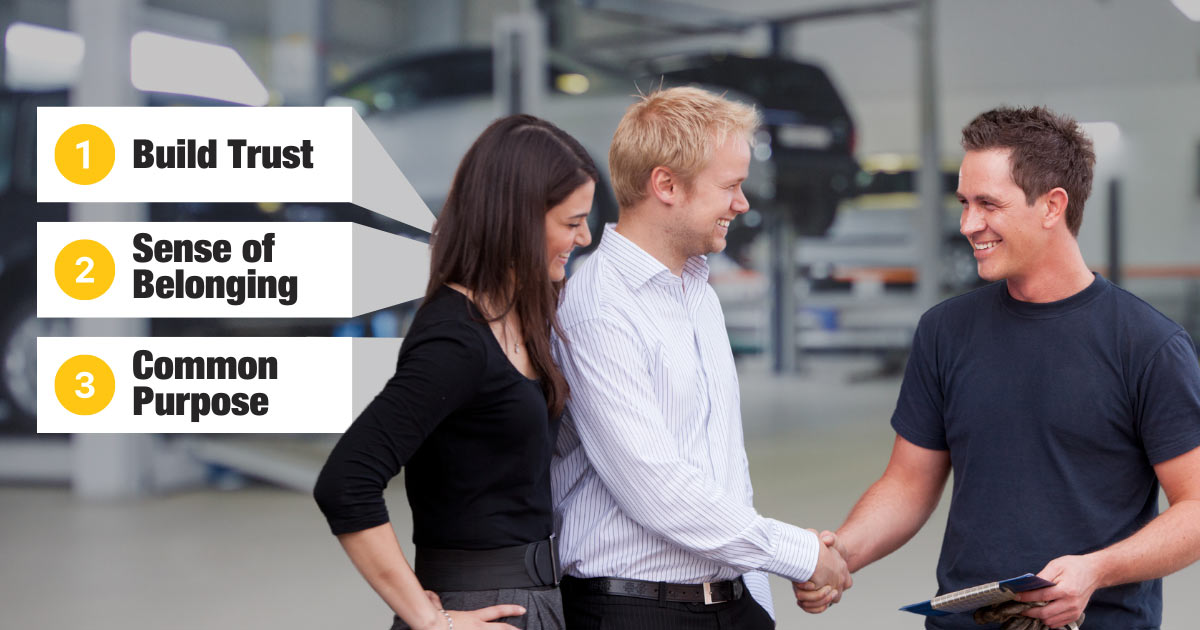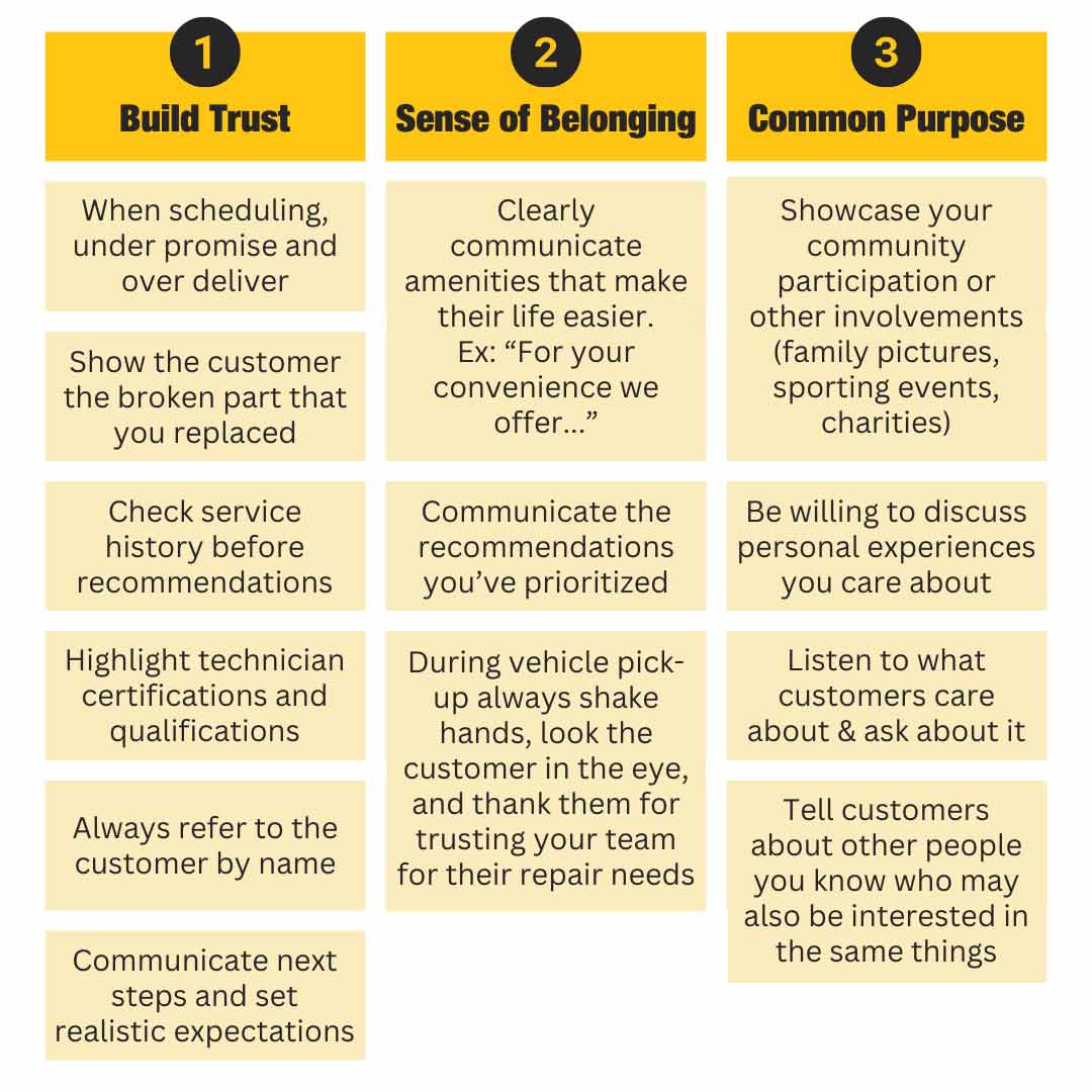 - Trust — Before they can do business with your shop, they must trust your competence and honesty. Trust helps supports a transactional relationship, but it isn’t enough by itself to drive loyalty.