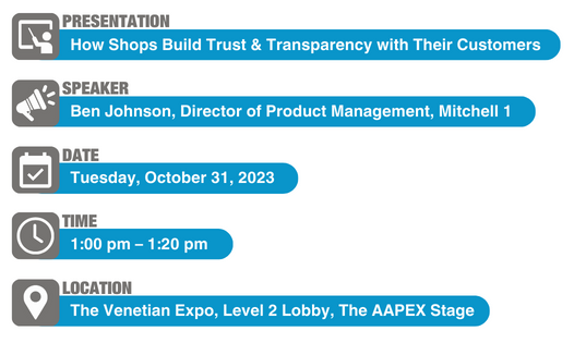 As part of the Let’s Tech series, Ben Johnson, director of product management for Mitchell 1, will reinforce the importance of customer connections during his presentation, “How Shops Build Trust and Transparency with their Customers!” The presentation will take place on Tuesday, Oct. 31 at 1 p.m. on The AAPEX Stage, located at the Venetian Expo in the Lobby (Level 2).