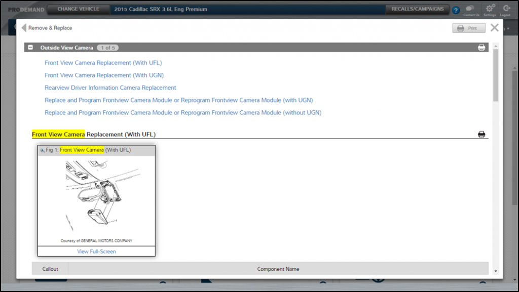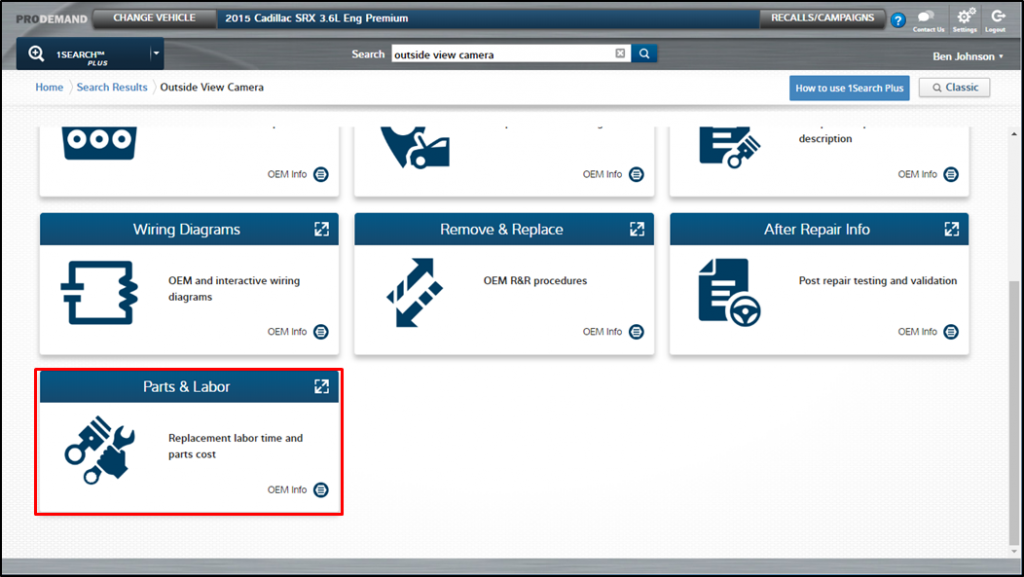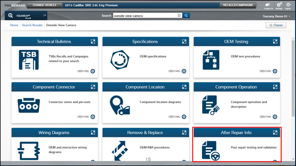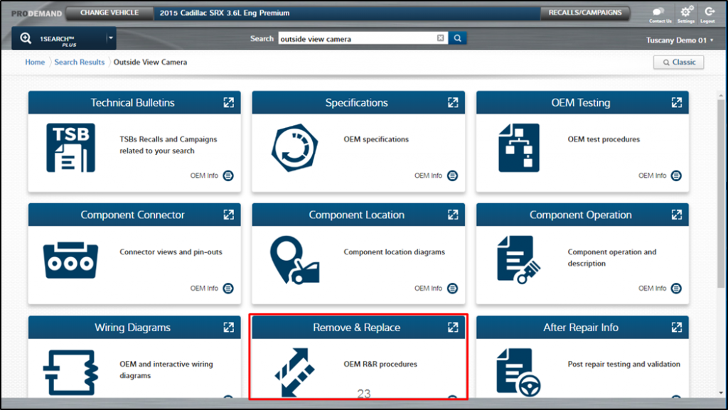 Step 2: Choose the feature on the left-hand side you will be working with. And now ProDemand will display only those sensors, cameras and other components which contribute to the operation of that feature. In this case, we have selected the “Automated Parking System.” If you have one component you’re interested in, simply select it. This will take you to the 1Search Plus card interface.