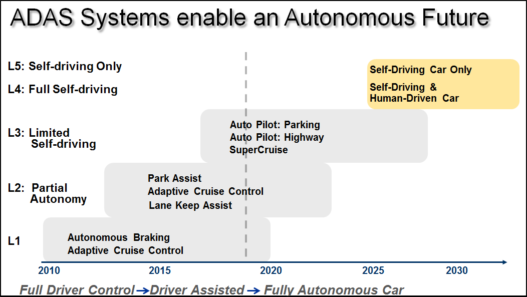 In addition to providing “right now” benefits to driver and vehicle safety, these sensors and systems enable the promise of what’s called the “L5”Autonomous vehicle – self driving where even the steering wheel is optional! There is some debate about when we’ll really start seeing these and when they’ll really be relevant in the car parc, but we already have L1 to L3 systems in place today.