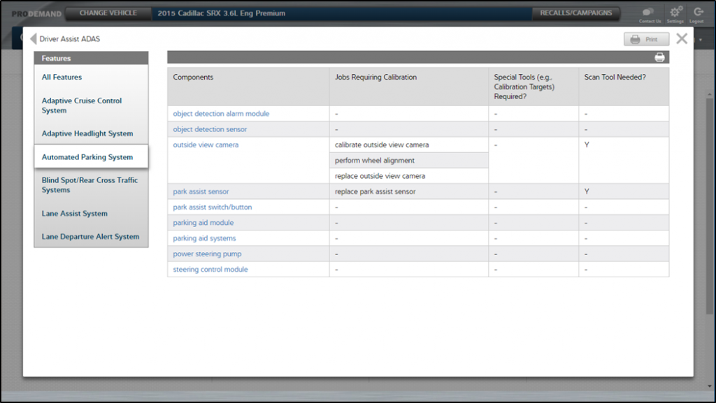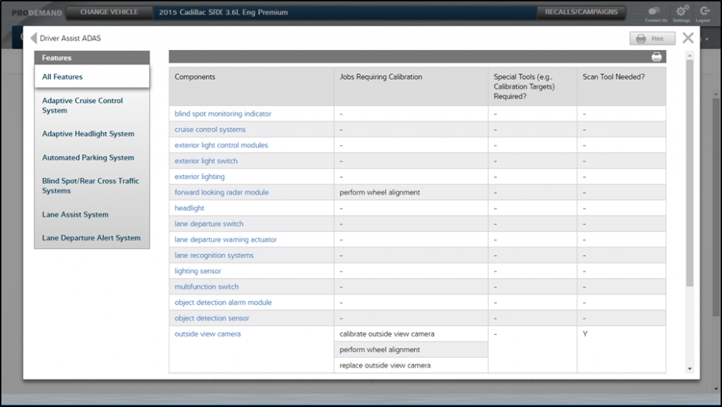 The picture below shows the ADAS quick reference for a 2015 Audi A6. On the left are the features that ProDemand considers to be part of the ADAS category. The table to the right shows the components that may be installed and the jobs you might perform that will require the component to be calibrated. ProDemand also lets you know if the job requires special tools such as targets and if a scan tool is required.