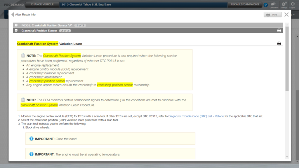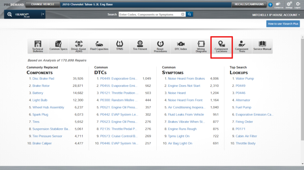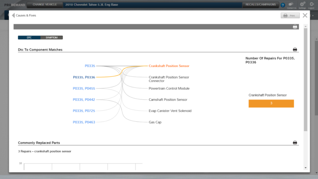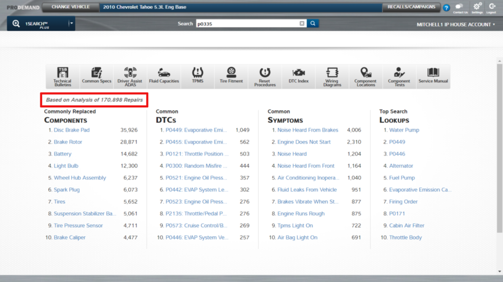 Using the same example with the Tahoe, when hooked up to a scanner, a P0335 Crank Position Sensor code was pulled. ProDemand has over 500 million repair records available on the vehicles it supports. For this particular vehicle, there are over 170,000 repairs in the ProDemand database (Figure 3)! To expedite a search, ProDemand includes a Top 10 list of most commonly seen repair issues, but because the P0335 code is not a top issue seen in this vehicle, you will have to do a search for it.