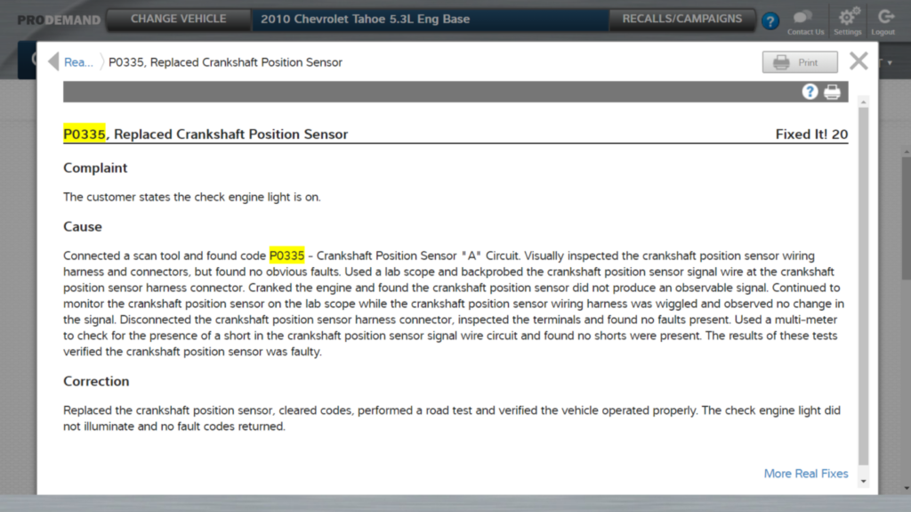 For our Tahoe example, the Real Fix, Top Repairs and Causes & Fixes cards were returned. It may be the first time you’re seeing the problem, but there’s a good chance somebody else has seen and fixed this problem. The Real Fixes card follows a Complaint – Cause – Correction approach, and it offers great insight to the problem.