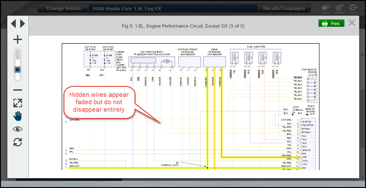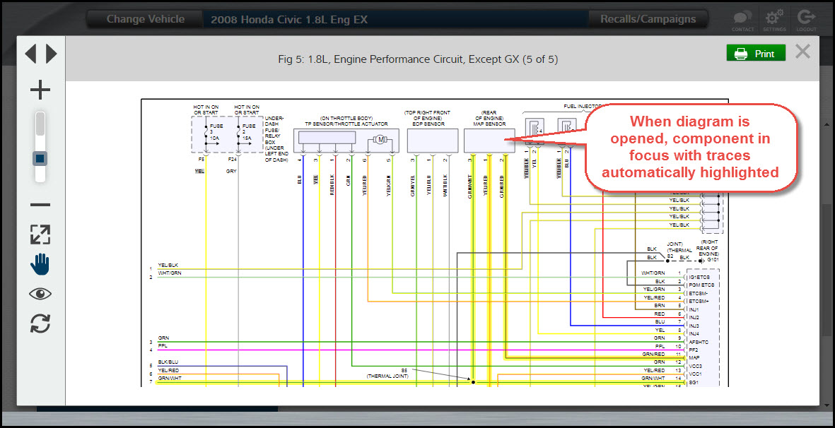 - Following that same navigation path through 1Search Plus, when the specific diagram is opened, the selected component will be in focus with all the associated wires already highlighted. Users can also click on other components to toggle highlighting of associated wires for each component. The benefit to techs is that they no longer have to scan through the page to find the specific component. Also, with one click, the technician sees all wires relevant to the component, rather than clicking on each wire for a component.