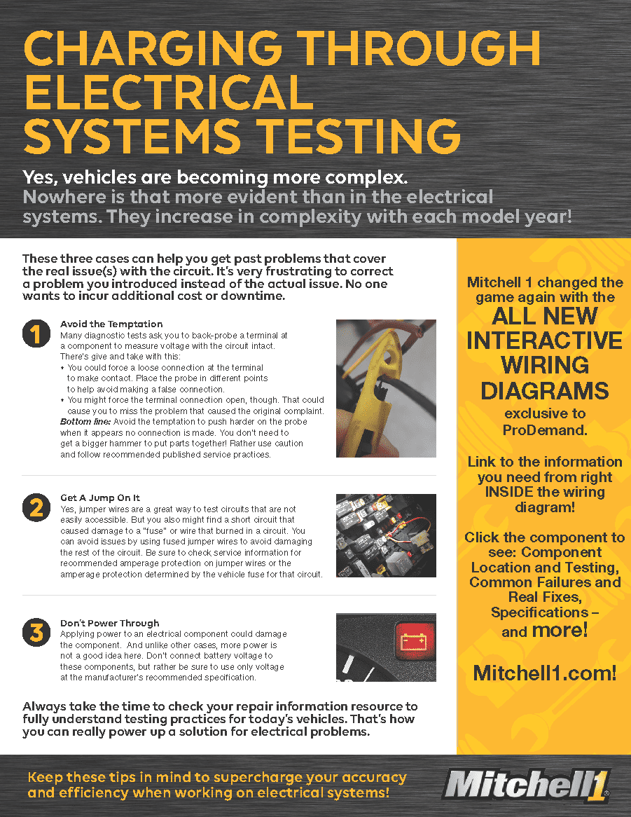 Today’s vehicles are becoming ever more complex – especially with regard to electrical systems. Mitchell 1 has three tips that every auto repair technician should keep in mind to supercharge your accuracy and efficiency when working on electrical systems. If you’re not following these electrical testing processes, you could be missing out on something big early on in your diagnosis!