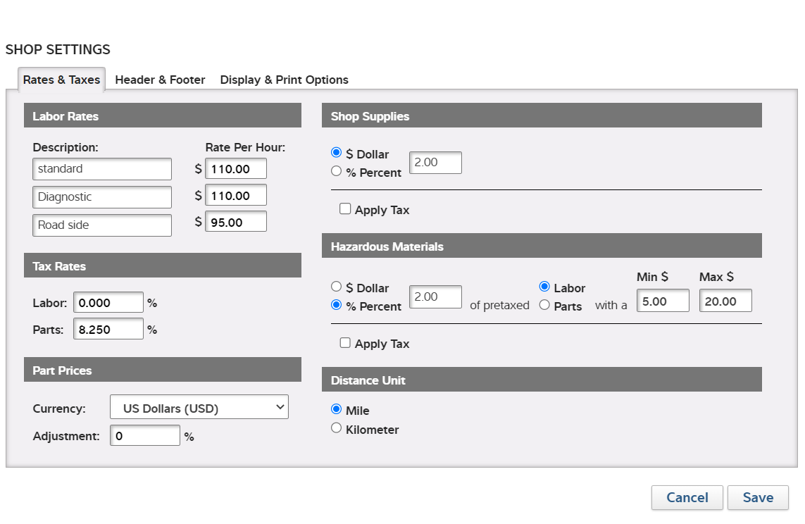 5- Adding shop settings for labor and tax rates, shop supplies, hazardous material charges, header and footer information, and estimate display and print options.