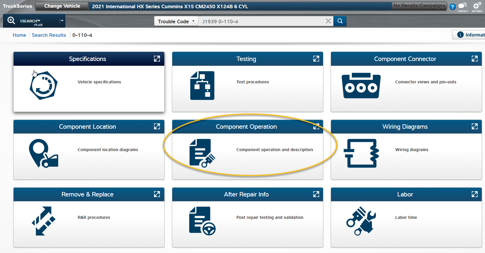4- Then click the link under the “Search Results” to open the available data for this fault code and select the “Component Operation” card.
