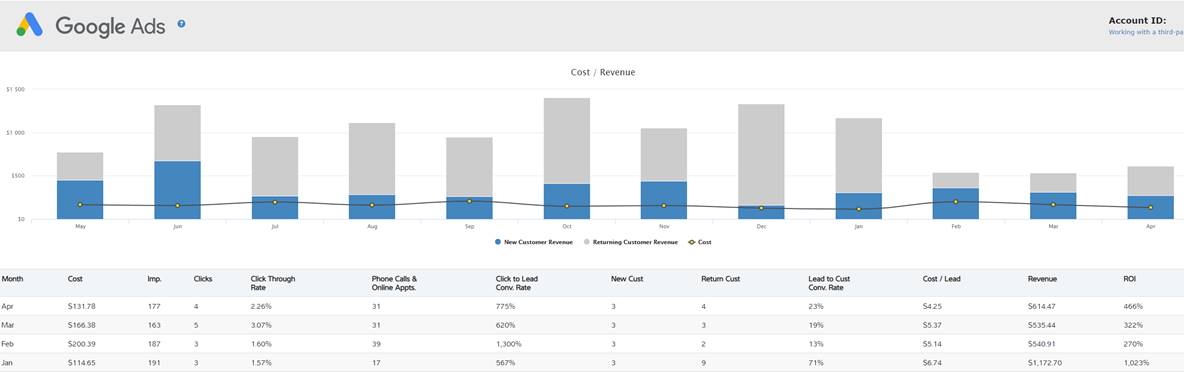 These numbers will most likely fluctuate depending on the search volume each month, but it is important to be seeing that new customer revenue on a frequent basis. Bringing back previous customers who made a search online is also a huge win as they may not have had your number handy the first time or were possibly considering a new repair shop and saw your ad instead.