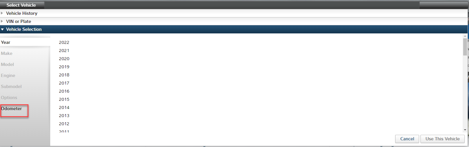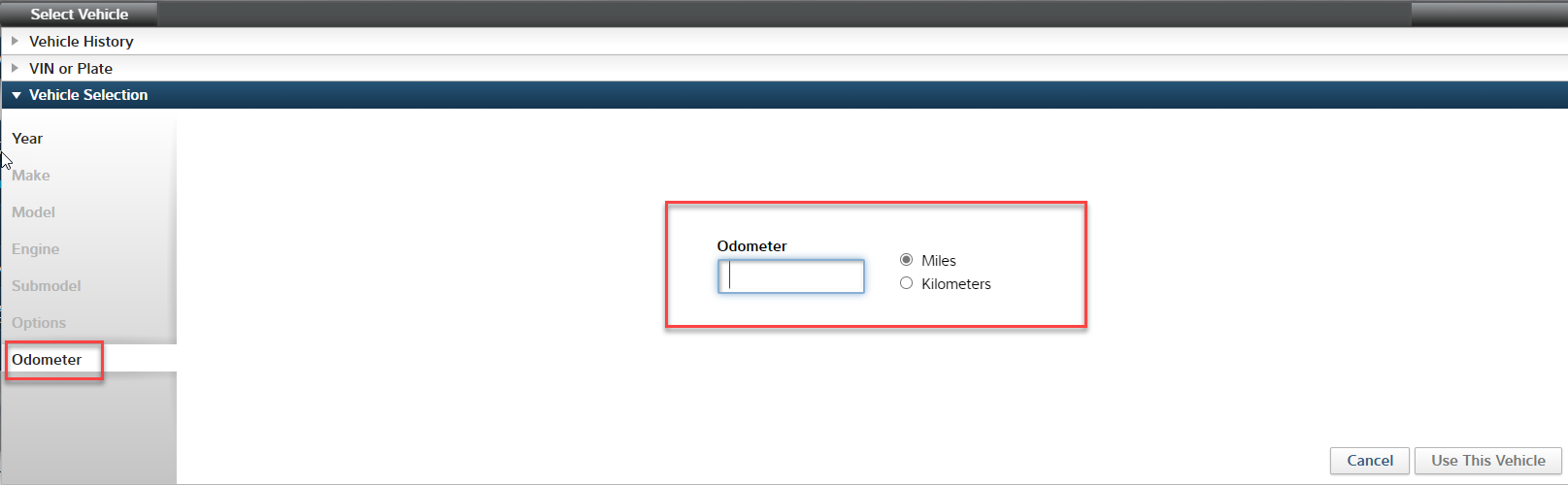 Odometer field will be present. Enter odometer reading and click Use this vehicle.